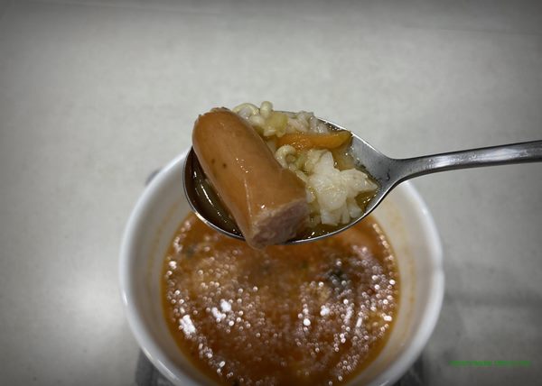 라면 국물에 밥 말아 먹으면서 소시지를 먹어 봅니다.